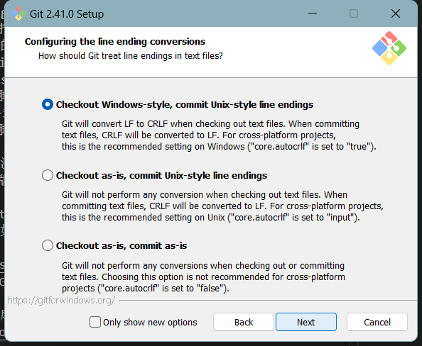 继续。Windows 平台下推荐选择第一个选项。这主要是考虑到,你在敲击回车键的时候,不同系统留下的换行符并不一致,Windows 使用的 CRLF,而 Unix 和 Linux 使用的是 LF,换行符不一致将导致文件出现换行符不统一的错误。