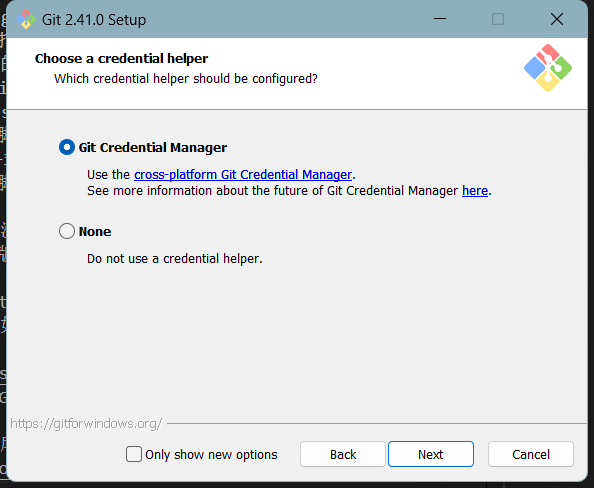 继续。请选择第二个选项,这样一来,Git 将会从 Windows 凭据管理器中读取凭据,除非你熟悉 OpenSSL,否则推荐使用 Windows 凭据管理器。