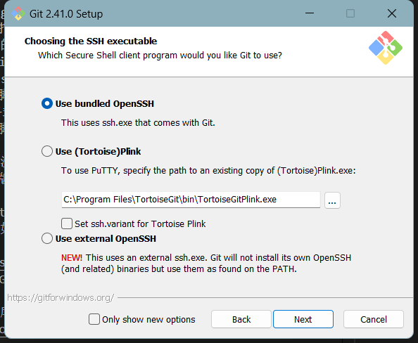 继续。使用何种 SSH 工具.一般使用 Git for Windows 自带的 SSH 也就是第一个选项就足够,如果你想使用其他工具如 PuTTY,可以勾选第二个选项并正确配置它,或者勾选第三个选项并自行为环境变量中的 PATH 添加相关路径。听不懂也看不懂 Git 的说明?没关系,选第一个就行了,这样就没有额外工作要做。
