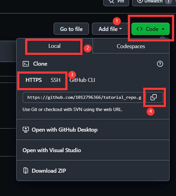 点击 <> Code 按钮,然后确保选中 Local 选项卡,在 HTTPS 和 SSH 中任选其一,点击拷贝按钮,将链接拷贝下来。