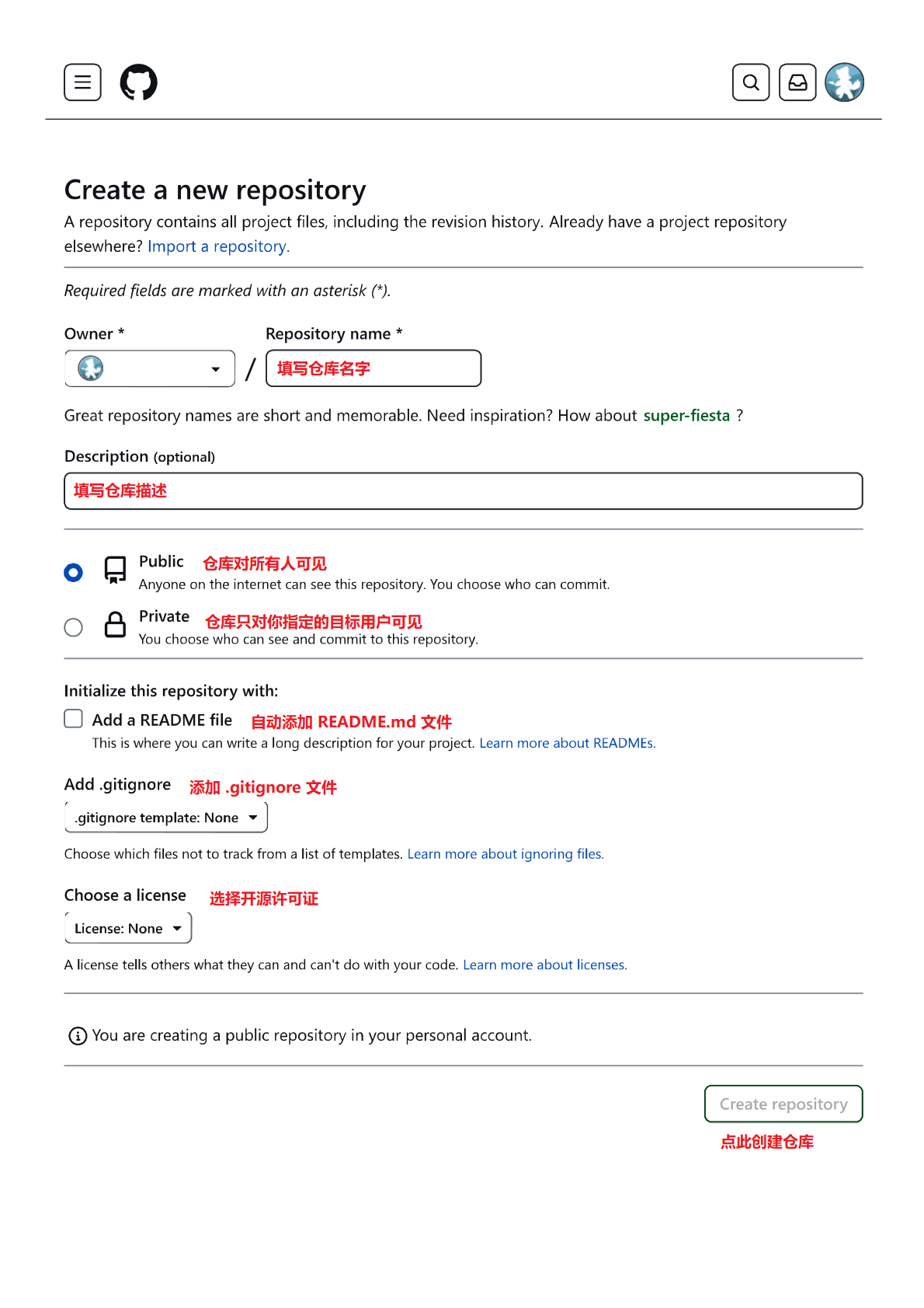 选择 Public 将意味着你的仓库对大众可见,而 Private 则意味着仓库只对指定的用户可见。根据你的需求选择即可,如果你只是想跟着本文学习一下使用,则选择两者皆可。