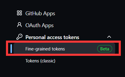 点开后在左侧边栏找到 Personal access tokens 并在展开后的子菜单列表中找到 Fine-grained tokens,将其点开。