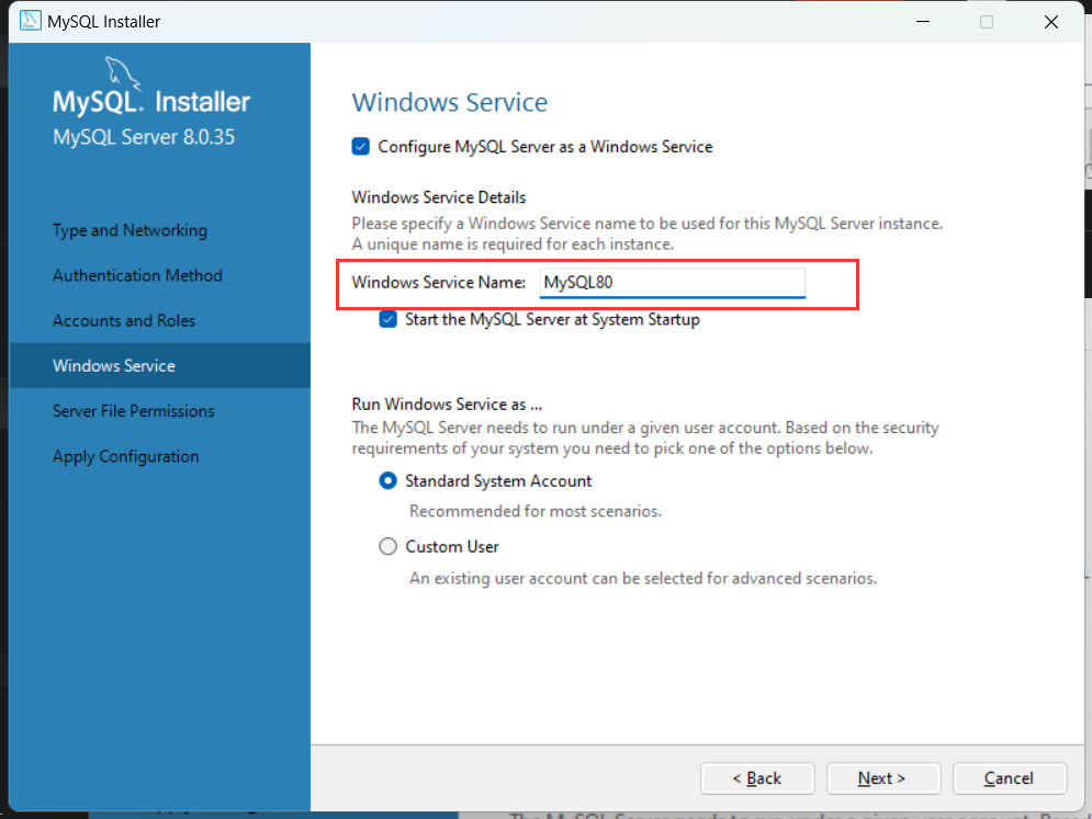 接着设定 MySQL 服务,我们在框中可以设定该服务的名字,通常你可以使用默认给出的名字 MySQL80,也可以改成别的。影响不大,你自己决定。